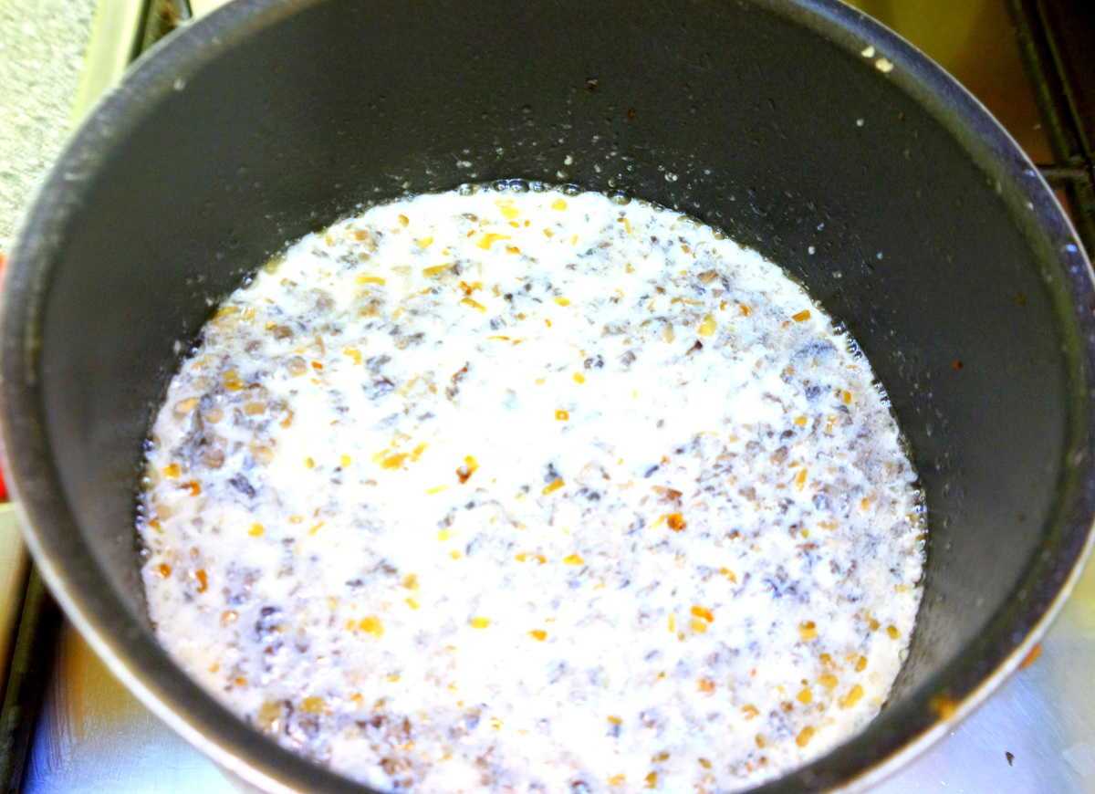 - Когда на сковороде всё готово, выливаем молоко, предварительно размешав в нём ложку муки. Солим, перчим, бросаем щепотку лимонной кислоты, перемешиваем, тушим семь минут.