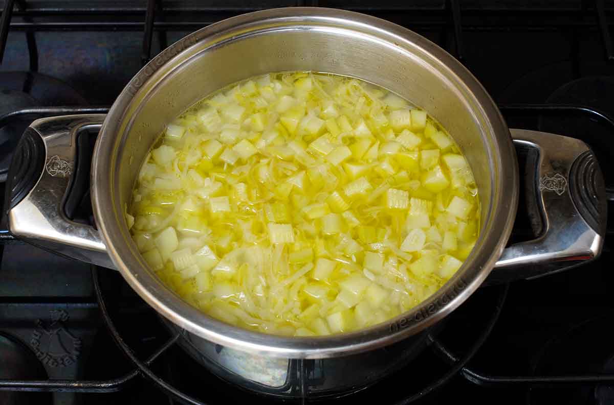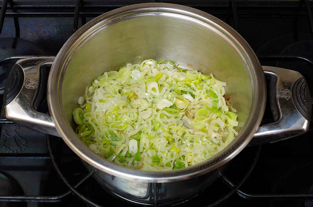 5. В суповой кастрюле на среднем огне обжарить лук-порей течение 6 – 8 минут до мягкости и прозрачности на смеси растительного и сливочного масла. Затем положить чеснок и готовить еще пару минут, часто помешивая.