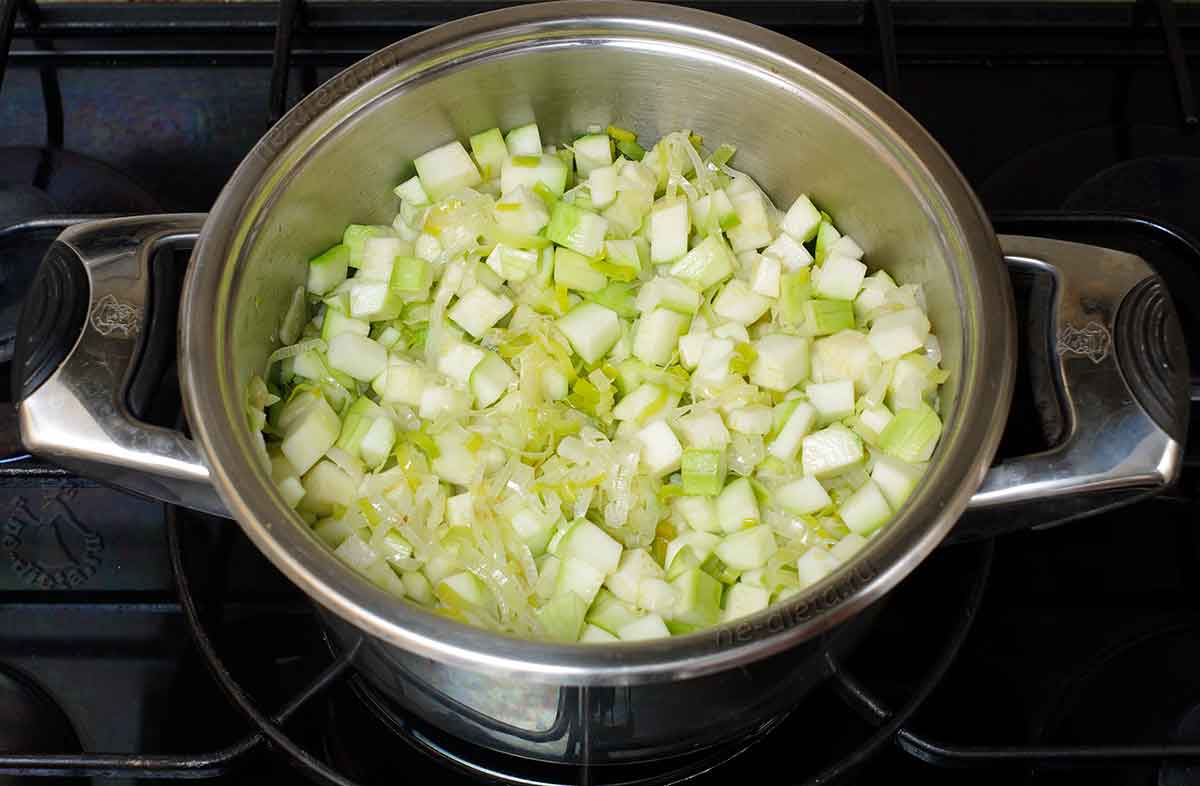 6. Высыпать в кастрюлю порезанные кабачки, все перемешать и готовить 3 минуты.