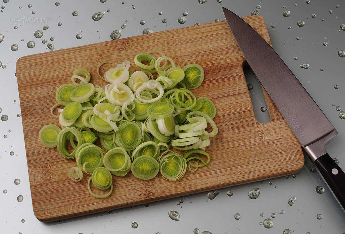 1. Для того чтобы приготовить суп-пюре их кабачков, прежде всего необходимо подготовить все его составляющие. Белую и светло-зеленую часть стебля лука-порея надо вымыть и нарезать тонкими колечками. Поскольку этот вид лука довольно дорогой и встречается не в каждом магазине, то его можно заменить на обычный репчатый лук.