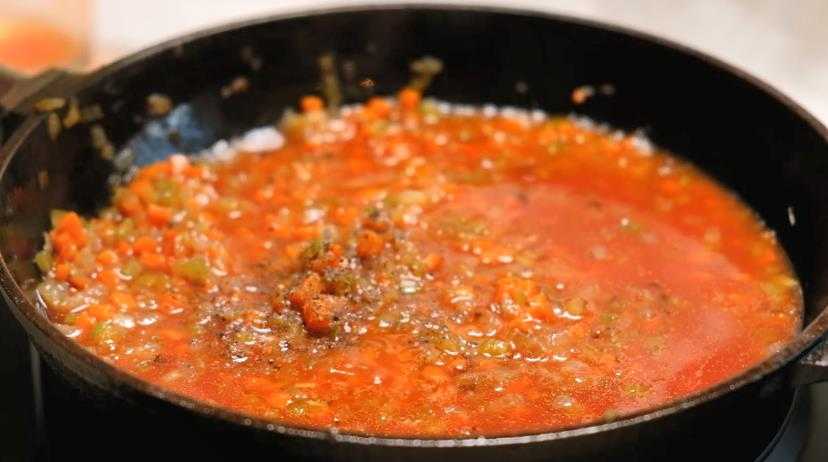 - Залейте овощи приготовленным на предыдущем этапе соусом и поставьте кастрюлю на медленный огонь.