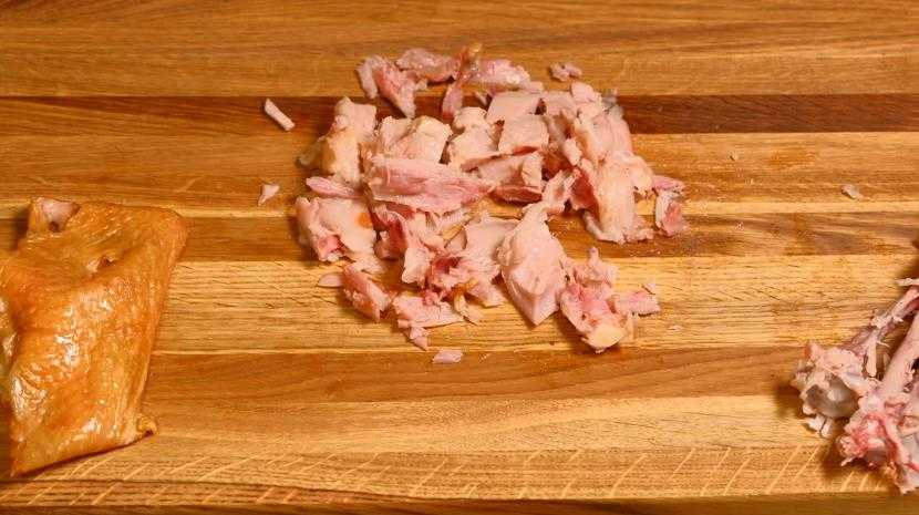 Копчености нарезать небольшими кубиками, отправить в кастрюлю. Через несколько минут добавить картофель, нарубленный маленькими ломтиками.