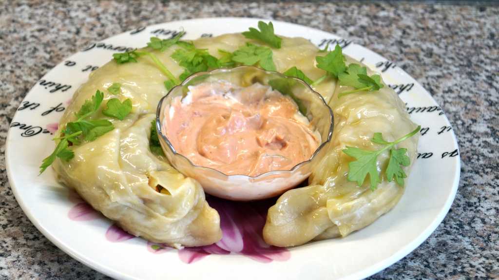 В мантышницу гюль-ханум укладывают по тем же правилам, что и урама-ханум, но стараются оставлять расстояние между цветочками около 2 сантиметров, чтобы в процессе варки пельмени не слиплись. Варка занимает 45 минут. Подают гюль-ханум на большой плоской тарелке. Блюдо украшают зеленью. Подойдет сметанный или томатный соус из рецептов ниже, обычная сметана или мацони. Едят мини-рулетики руками или вилкой.