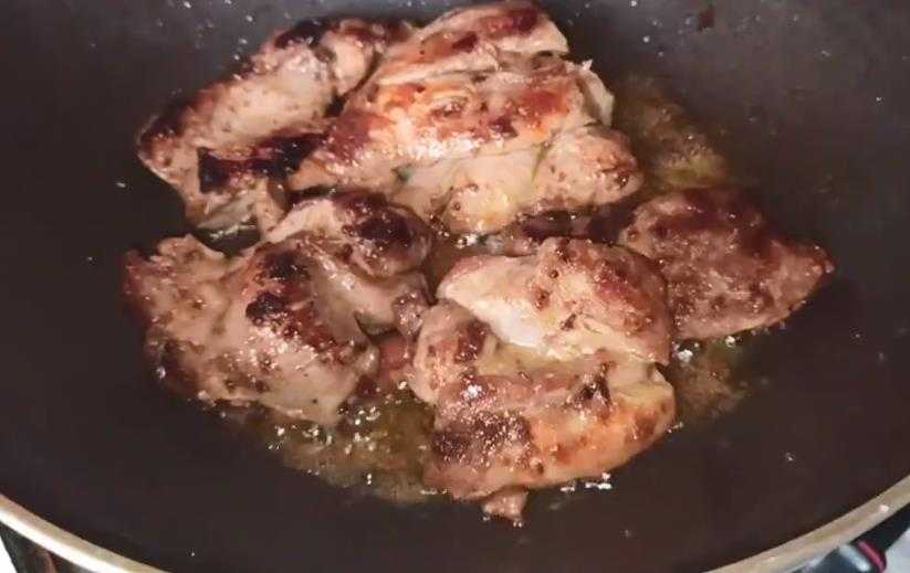 3 Сковороду хорошо накаляем, смазываем маслом и кладём мясо, накрываем крышкой, пока курица не подрумянится и немного побелеет сверху. Не переворачивайте мясо лишний раз, пускай одна сторона, хорошо подрумянится и только тогда, переворачиваем мясо. В общей сложности, на каждую сторону, у нас уйдёт 2-3 минуты.