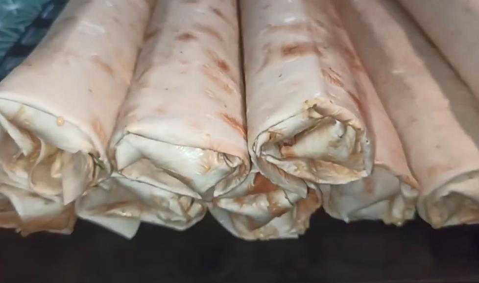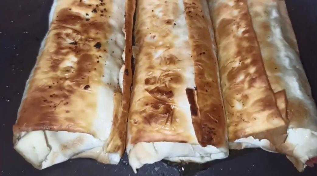 - Заворачиваем рулетом, сверху кисточкой смазываем небольшим количеством растительного масла и обжариваем на сухой сковороде до золотистого оттенка.