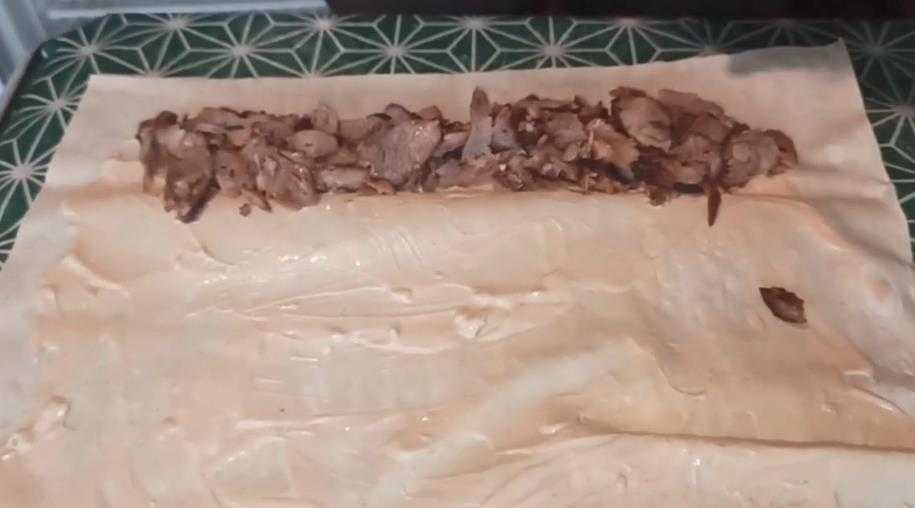 - Готовый лаваш выложить на кухонное полотенце, сверху накрыть влажной салфеткой для того чтобы выпечка не засохла.