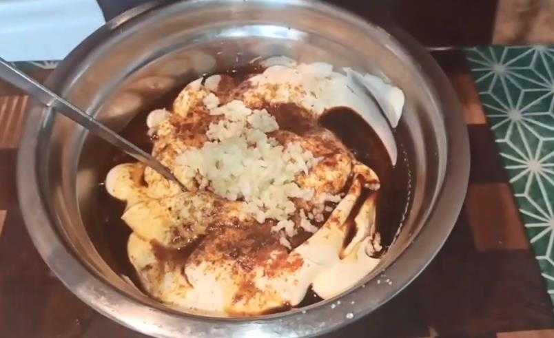 2 Маринуем мясо в течение 15 минут. Маринад может быть любой, мёд, горчица, соевый соус, то, что вам больше всего нравится.