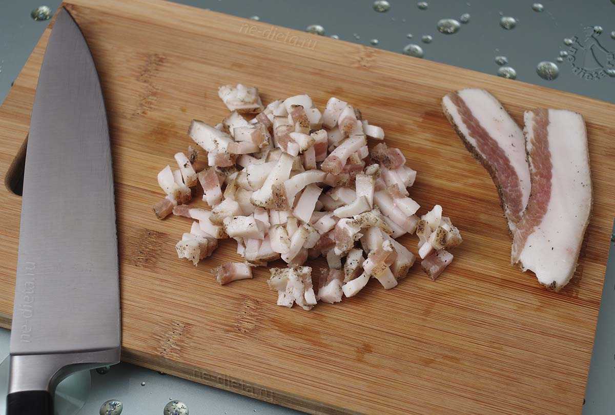 Использовать в данном рецепте можно абсолютно любое мясо, однако, как на мой вкус, так лучше всего в этом прекрасном блюде смотрятся и наводят аппетит шкварки – сало с мясными прослойками. Ну, а если вы желаете получить диетическое блюдо, то берите куриную грудку или говядину. Кроме того заменить мясные кусочки можно еще и фаршем, выбирайте сами
