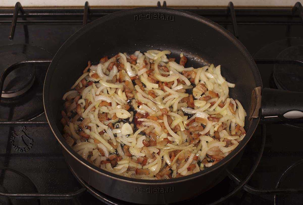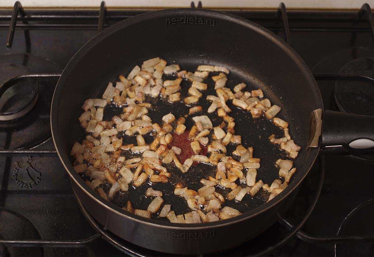 Положить лук с чесноком в сковороду с салом и обжарить на среднем огне в течение 5 — 7 минут до прозрачности.