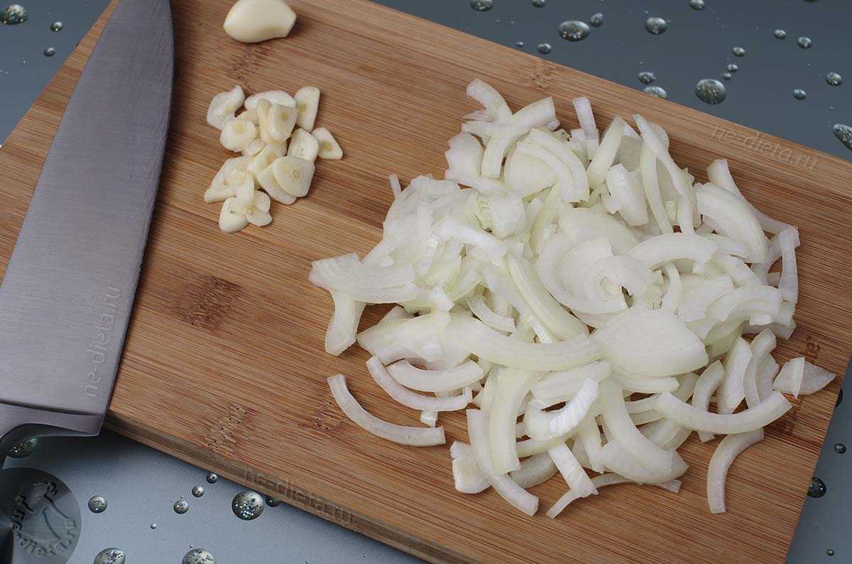 Лук и чеснок очистить от шелухи. Зубчики чеснока нарезать тонкими пластинками, а головку репчатого лука – четверть-кольцами.