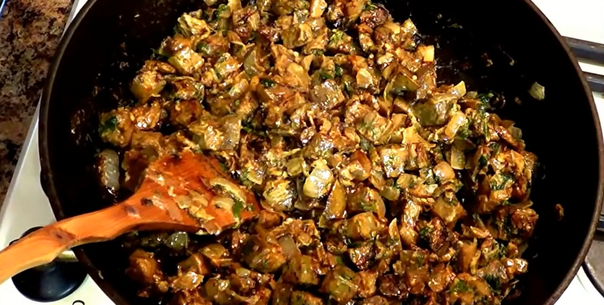 - Как только маринад закипит, к нему добавляются отварные баклажаны, после чего полученную массу следует проварить на медленном огне в течение 10-15 минут, постоянно помешивая.