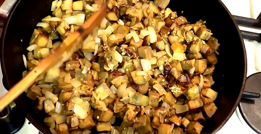 3. Обжариваем баклажаны вместе с луком на растительном масле до золотистой корочки на среднем огне. Масла после яичной заливки потребуется меньше, а чтобы овощи не пригорели, нужно будет постоянно помешивать.