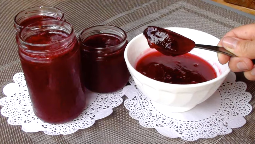 После чего в горячем виде разложим по стерильным банкам и закроем полиэтиленовыми крышками. Храним в холодильнике. А сейчас — к традиционному рецепту, с варкой. Понадобится килограмм сахару на килограмм ягод и стакан воды. Это будет желированное варенье. Чистые ягоды поместим в эмалированную посуду, вольем воду и кипятим минуты две. Протрем, всыплем сахар и варим с полчаса. Это варенье надо горячим закатать крышками.