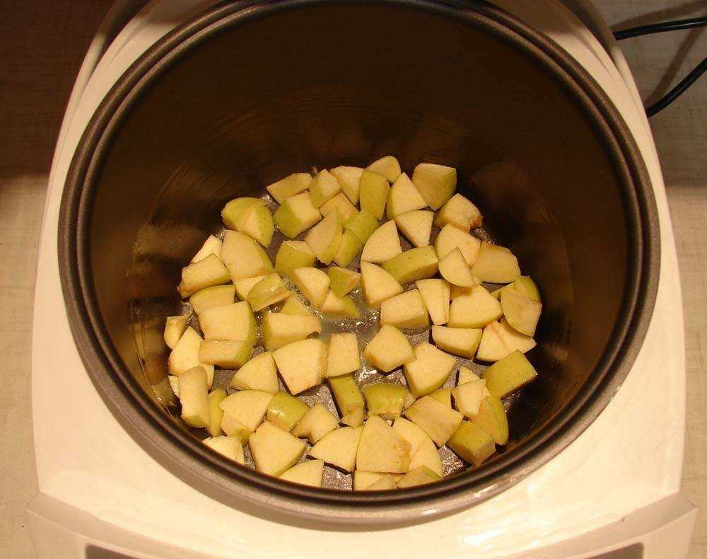 В данном рецепте кусочки яблок провариваются равномерно, полностью. Помешивать не нужно, к стенкам чаши ничего не пристает (если конечно у вас все в порядке с покрытием чаши). Все продукты просто закладываются.