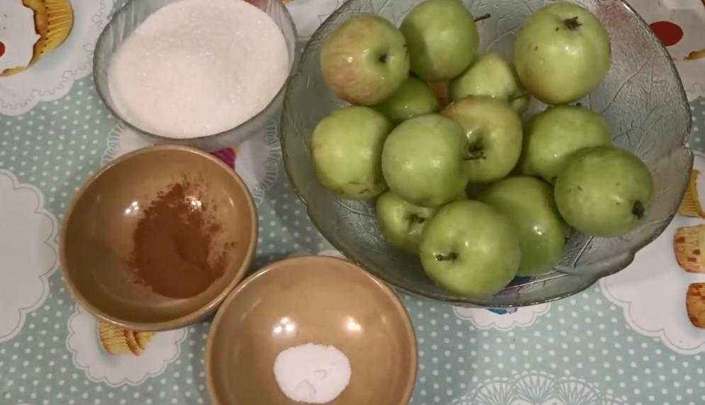 Для приготовления десерта нужно запастись сочными зелеными плодами. На килограмм яблок берем такое же количество сахарного песка, две чайных ложки лимонного сока или половину чайной ложки лимонной кислоты, немного питьевой воды. Конфитюр готовится по следующей схеме: