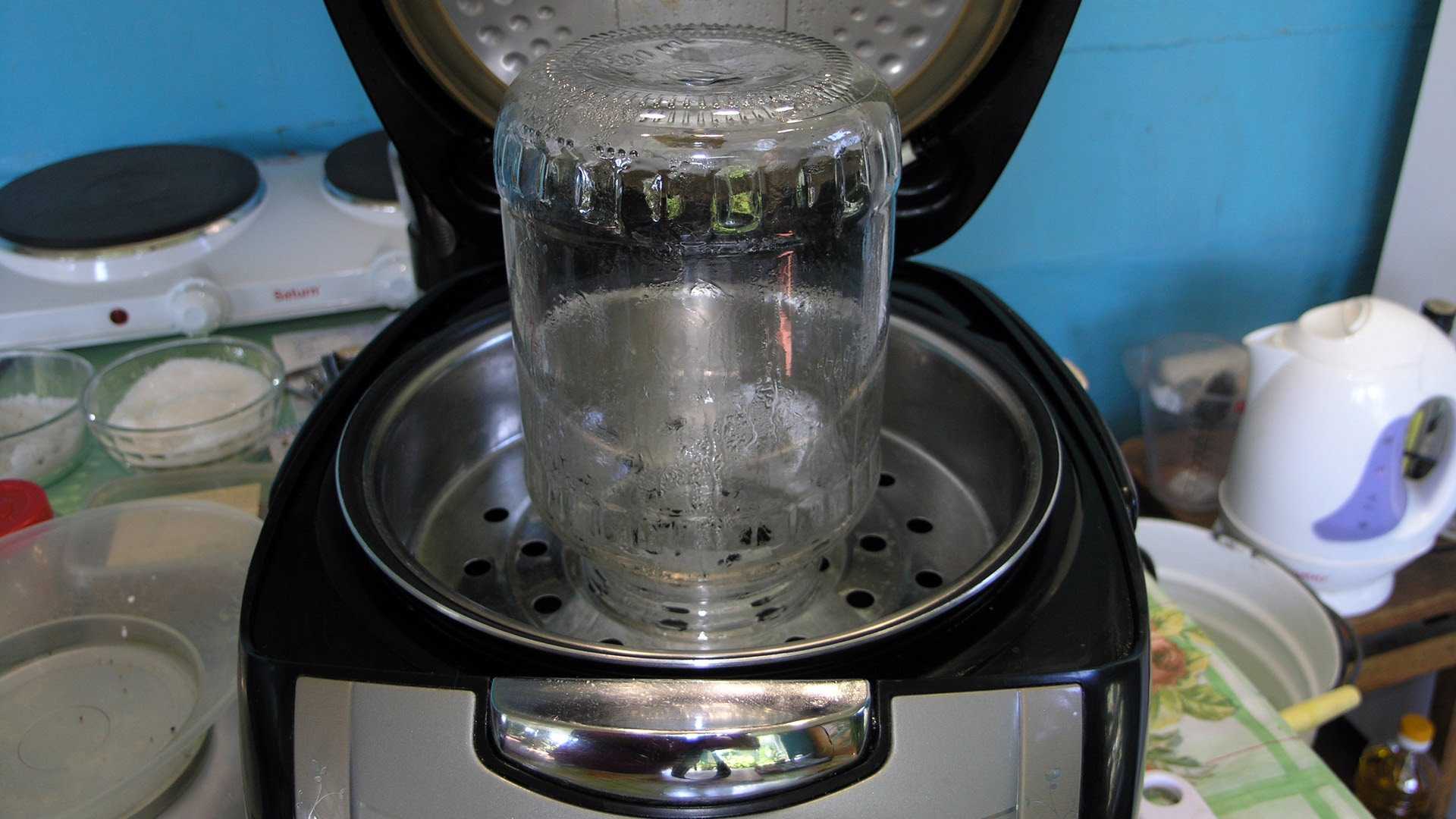 - Обрабатываем паром нашу стеклотару, а также крышки.