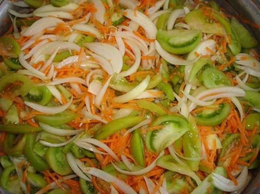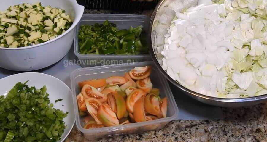 - Почистить и порезать все овощи (капусту мелко нашинковать; морковь натереть на крупной терке; лук нарезать полукольцами; помидоры и болгарский перец нарезать полосками).