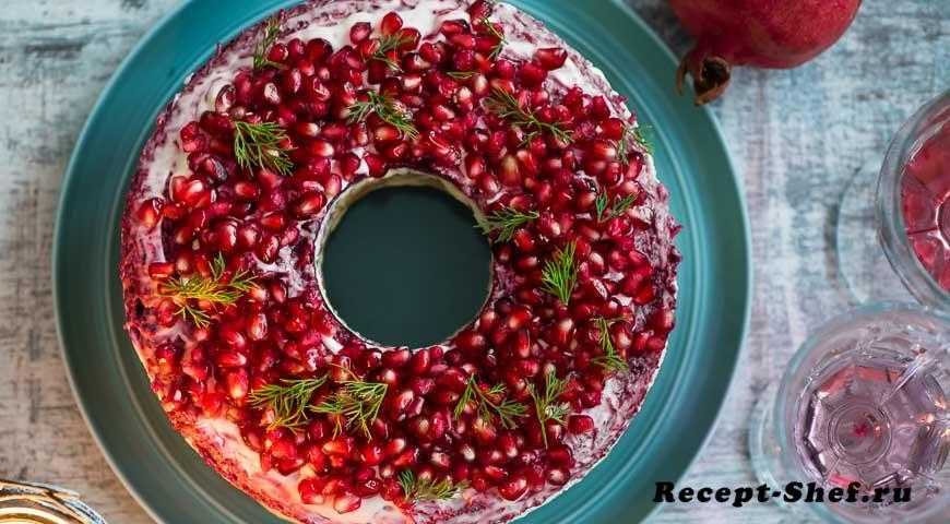 Хорошо утрамбовать салат, накрыть пищевой пленкой и убрать в холодильник на пару часов. После чего аккуратно вынуть стакан. Плотно покрыть весь салат гранатом и заново убрать в холодильник на 2 часа.