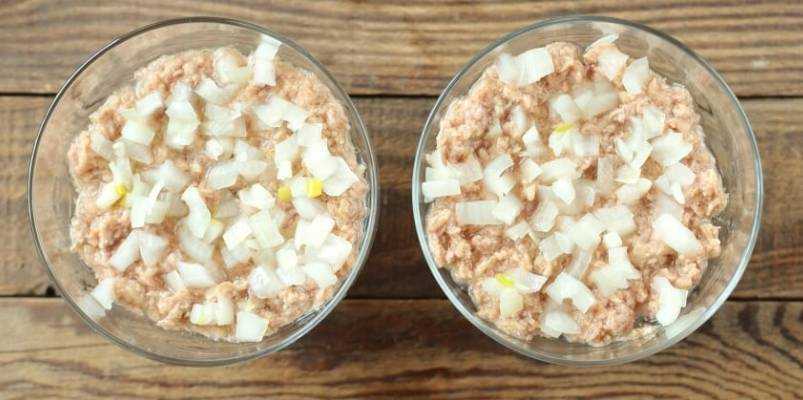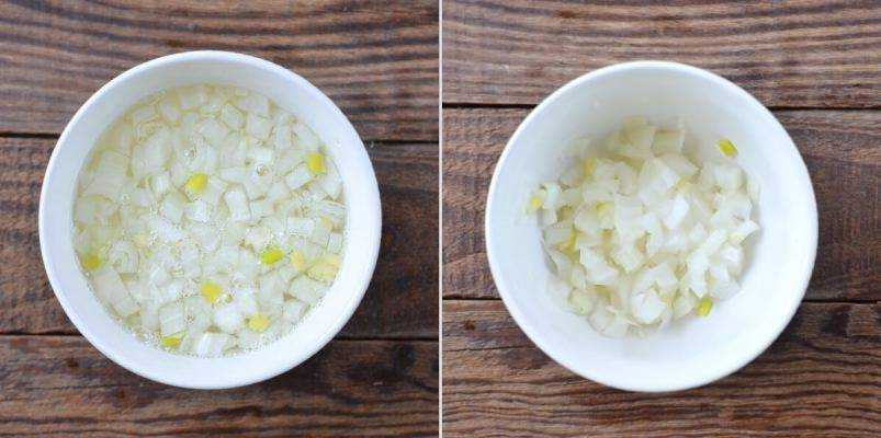 - Репчатый лук очищаем от кожуры, мелко нарезаем и замачиваем в кипятке, чтобы убрать лишнюю горечь. Достаточно будет 10 минут.