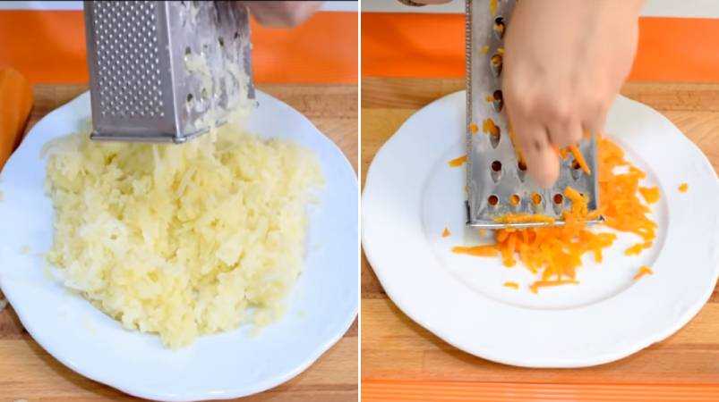 Отварные морковь и картофель натираем на мелкой терке. Складываем в отдельные миски.