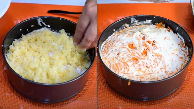 Шаг 7. Добавляем новый слой из оставшегося тертого картофеля. Сверху майонез, раскладываем тертую морковь и ещё раз промазываем соусом.