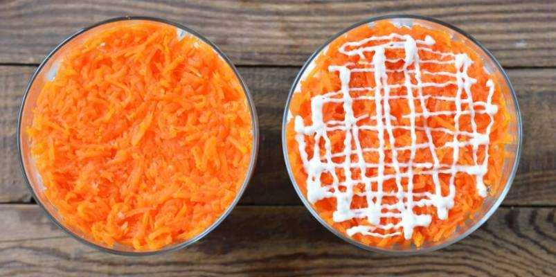 Вторым слоем выкладываем половину тертой моркови. Также наносим слой майонеза.