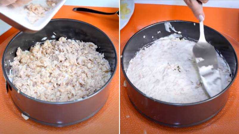 Шаг 6. Затем мы положим слой рыбы (в моем случае тунец, но вы можете использовать скумбрию, лосось или другие рыбные консервы, которые вам нравятся). С консервы нужно слить сок и размять рыбу вилкой. Слой слегка уплотняем и снова покрываем майонезом.