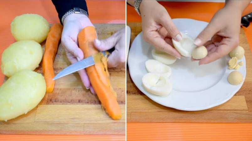 - После того, как овощи и яйца сварились, даем им немного остыть. Яйца чистим от скорлупы и делим на белок и желток.