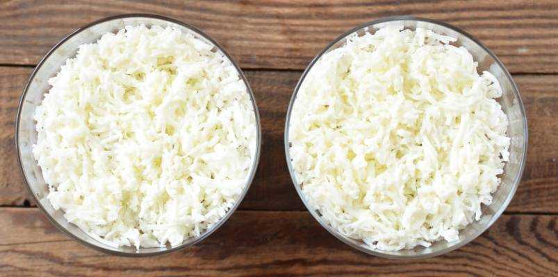Кроме выше описанных рецептов «Мимозы», есть еще один. И в нем вместо картошки и моркови используется рис. Получается довольно оригинальный вкус. Сливочное масло придаст дополнительную нежность. Но если вы категорически против этого компонента, не добавляйте его.
