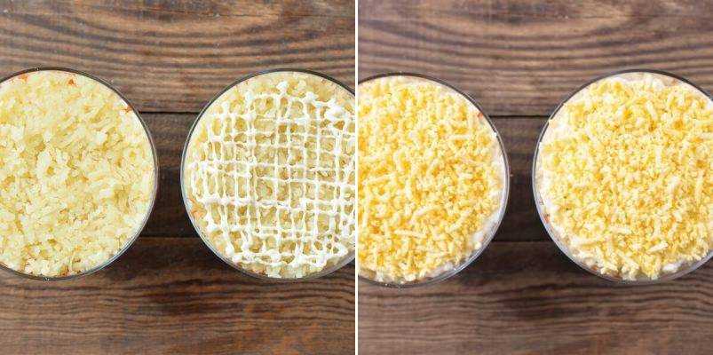 - Следующим слоем будут натертые яичные белки, их тоже смазываем майонезом и разравниваем.