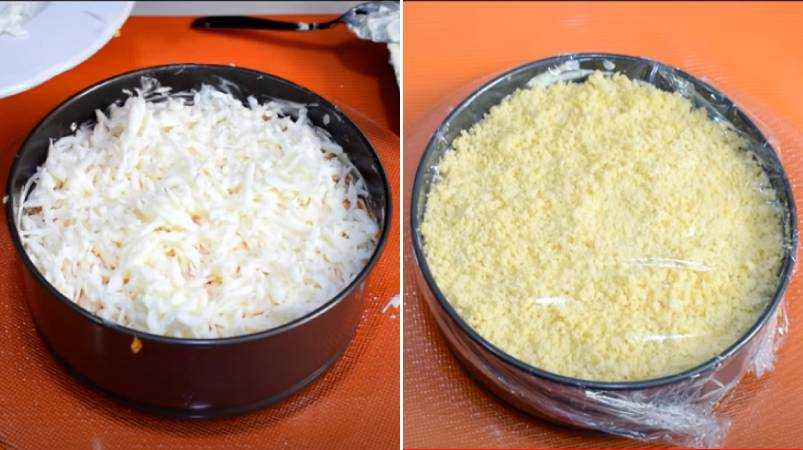 - Последним слоем будут тертые желтки, они выступают в роли украшения. Также, можно добавить немного пучков зелени, маслин для красоты.