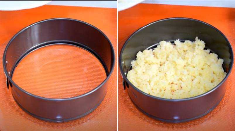 Шаг 5. Нам осталось только собрать салат слой за слоем. Ставим кольцо от формы на плоское блюдо. Первым слоем положим слой из половины тертого картофеля, а сверху — слой майонеза. Майонез должен покрывать картофель тонким слоем. Для приготовления используем свежий домашний. Как его сделать, смотрите в конце этого рецепта.
