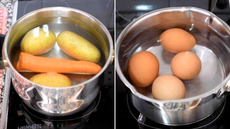 - Также, понадобится вторая кастрюлька для варки яиц. Ставим все на огонь, варим до полной готовности. Следите, чтобы картофель не разварился.