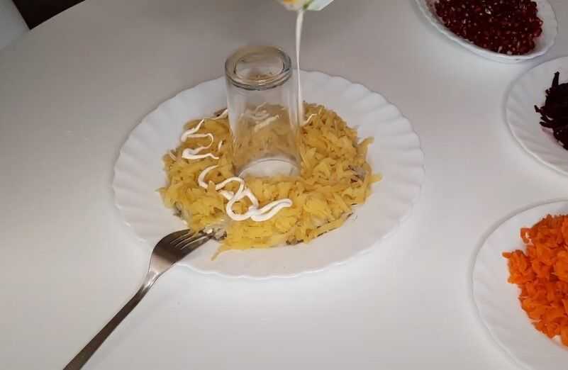 6. Берем плоское блюдо и на середину ставим стакан. Выкладываем по кругу тертый картофель смазываем майонезом.