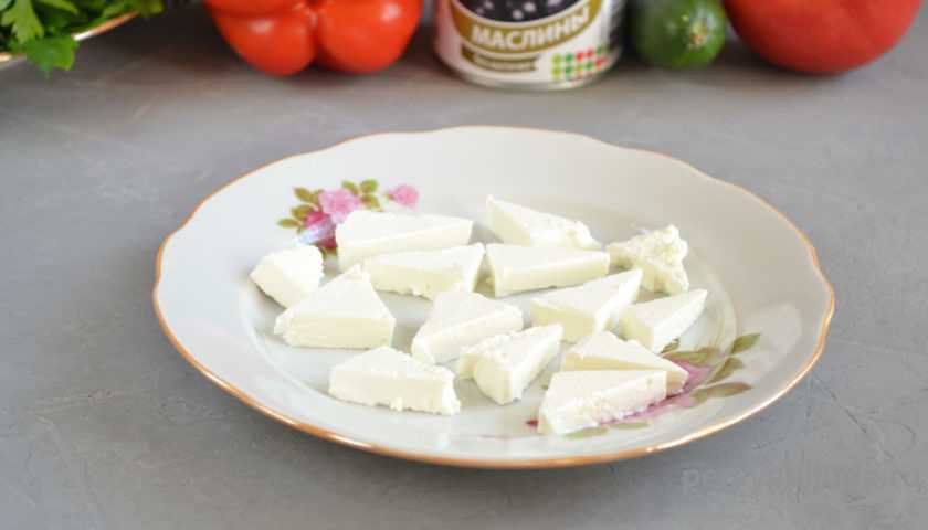 Следующий компонент — сыр фета, но можно использовать и обыкновенную брынзу. Нарежем его также кубиками и выкладываем на салат.
