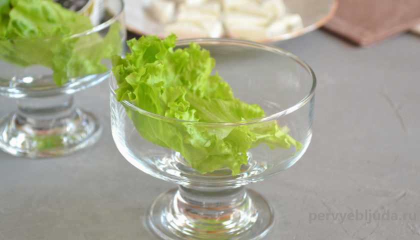 5. Для придания праздничного вида салатик будем подавать в порционных стаканчиках (креманках), которые хорошо промываем и вытираем полотенцем. Красивые неповрежденные листья салата промываем и высушиваем на бумажных полотенцах или обычном кухонном полотенце. С одного боку в стаканчики выкладываем по одному подготовленному листику салата.