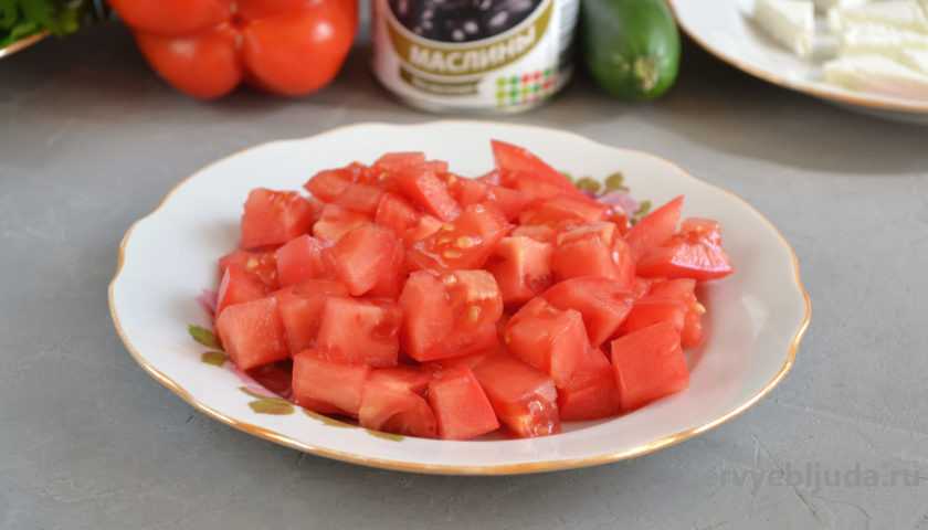 Помидоры разделите на две равные части. После каждую половину нарежьте на кубики среднего размера.