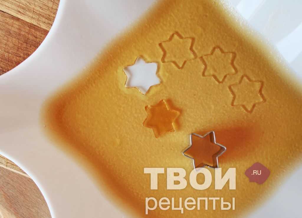 Приготовить мармелад: яблочный сок влить в сотейник, добавить инвертный сахар и довести до кипения, когда жидкость начнёт бурлить, просеять через сито агар-агар, убрать с плиты, при необходимости комочки растереть ложкой. Вылить жидкий мармелад в плоское блюдо и дать ему застыть. Вырезать формочками декор, остальное раскрошить вилкой или ножом.