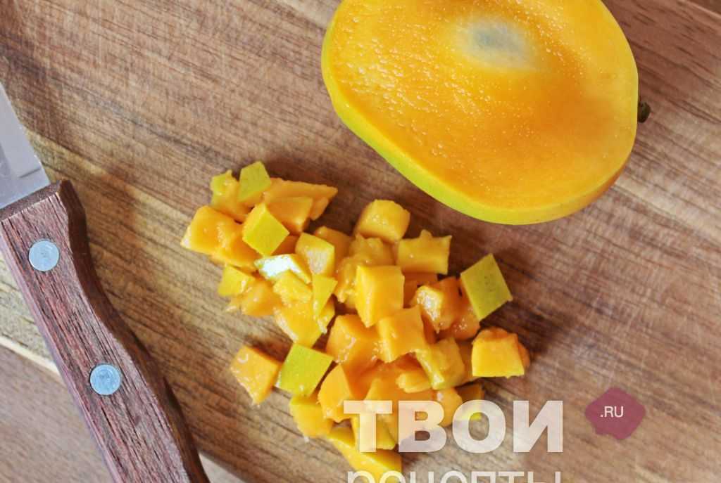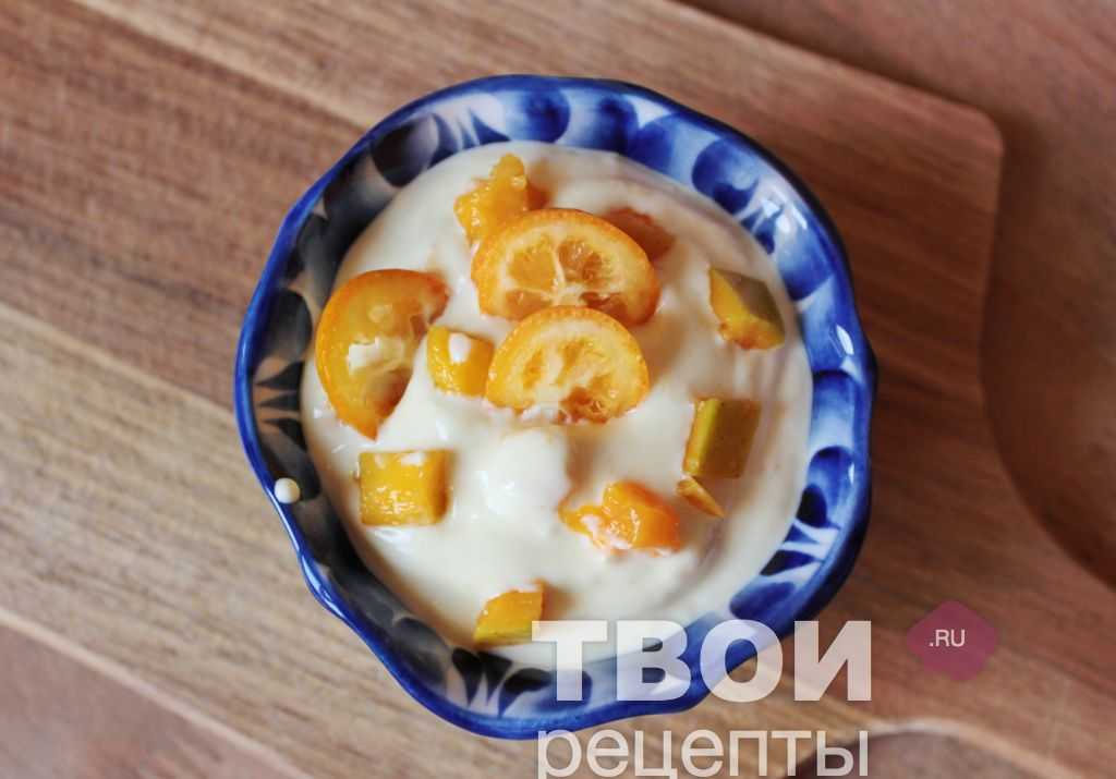 В этом лёгком и изящном салате есть всё: сытная основа на йогурте и творожном сыре с карри и чесноком, немного экзотики — кумкват и манго и кое-что на манер высокой кухни — яблочный мармелад на агар-агаре. Все эти достаточно мощные фруктовые аккорды завершает лимонная мелисса. Кстати, она для женщин — афродизиак, а вот чеснок и манго — он самый для мужчин. Словом, как ни крути, но такой фруктовый салат с йогуртом для романтического вечера станет самым подходящим вариантом десерта. Не пугайтесь, что в его составе есть чеснок, он очень тонко сочетается как с цитрусовыми нотками кумквата, так и с манго. Пробуйте смелее, и вы поймёте, жизнь в такой еде прекрасна! Кстати, про манго: если вы купили этот фрукт слегко «дубоватым», оставьте его на пару дней в бумажном пакете с бананами, манго дойдёт и станет сочным и мягким.