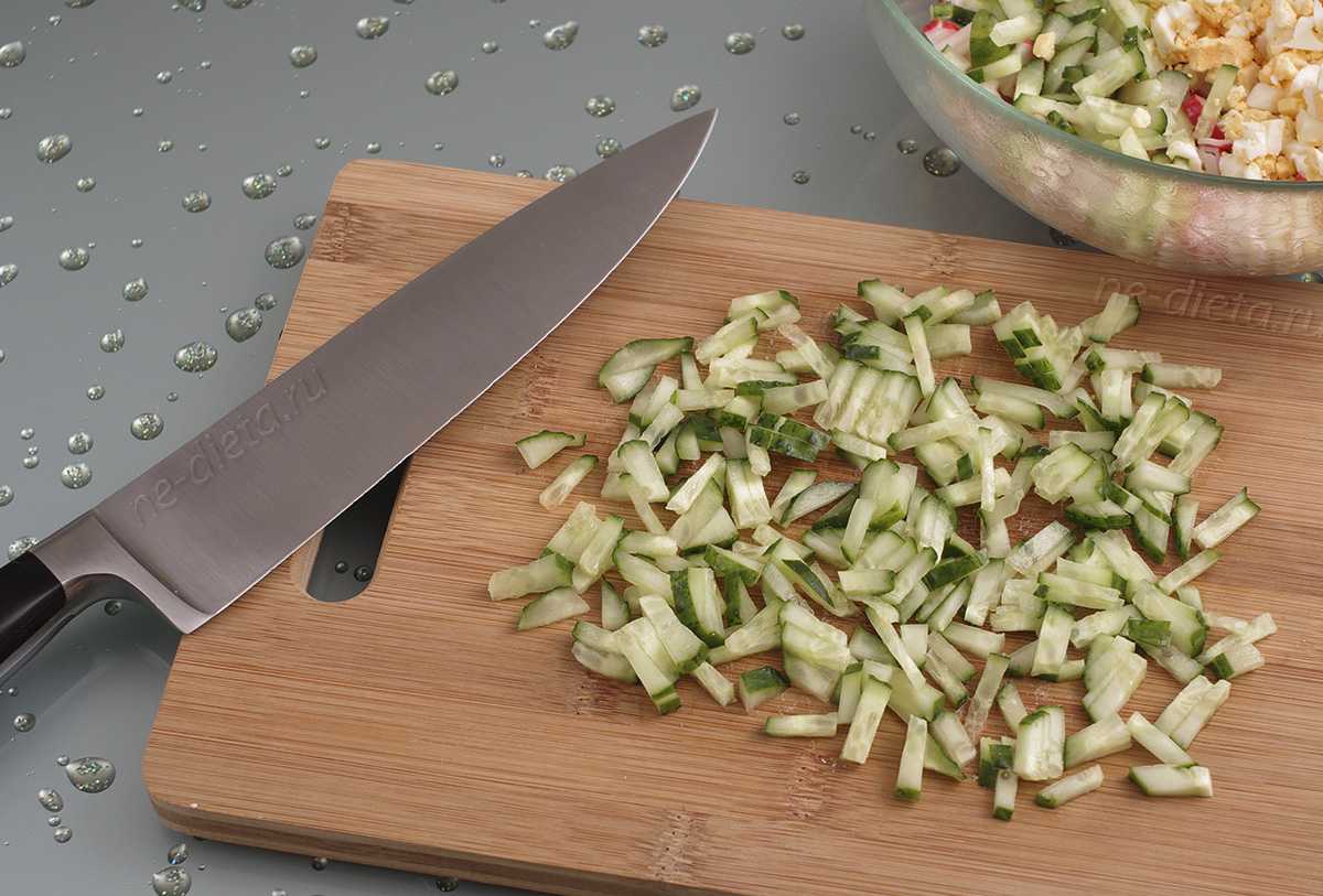 Огурец порезать кубиками или соломкой и положить к остальным ингредиентам. Зимние огурцы иногда лучше очищать от кожуры, чтобы она не испортила консистенцию салата, однако, сейчас в продаже есть овощи на любой вкус и кошелек, поэтому если кожица у огурца светлая и тонкая, то о ней можно не беспокоиться.