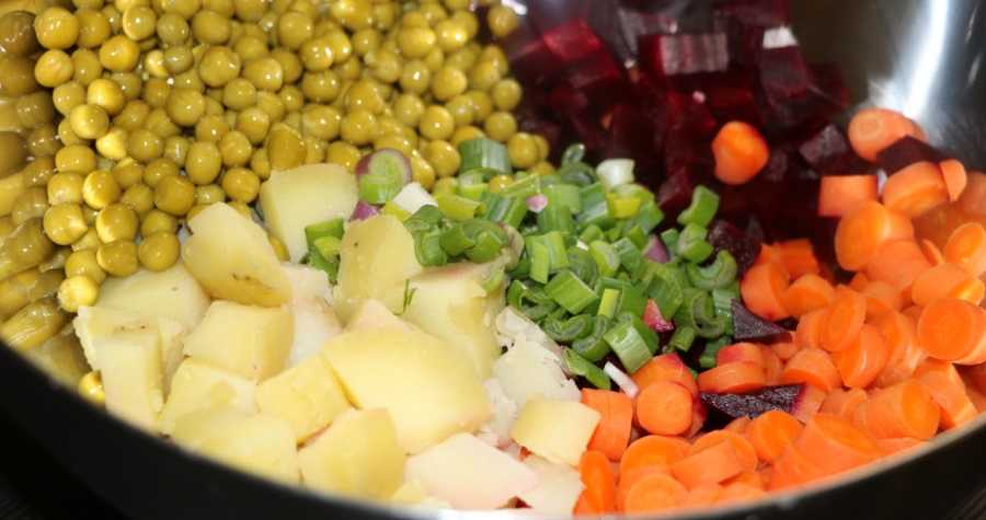 - Морковь, картофель и свеклу отвариваем выбранным способом, когда они полностью остынут, очищаем их от кожуры и нарезаем кубиками;