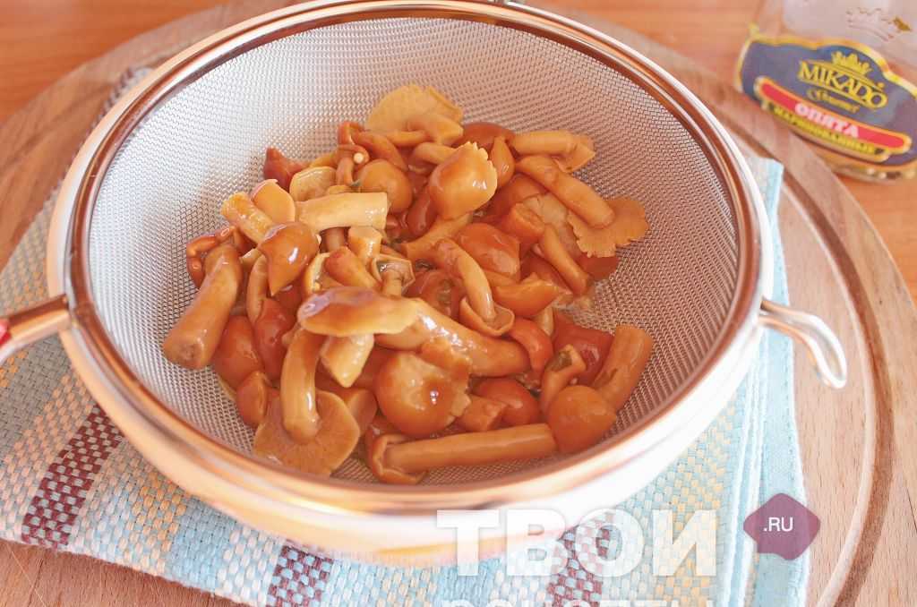 Грибы откинуть на сито, слить маринад. Несколько грибочков оставить для украшения.