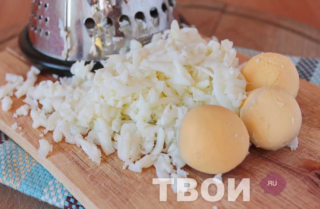 Яйца отварить, остудить под холодной водой, очистить. Белок натереть на крупной тёрке, желток — на средней и оставить для посыпки.