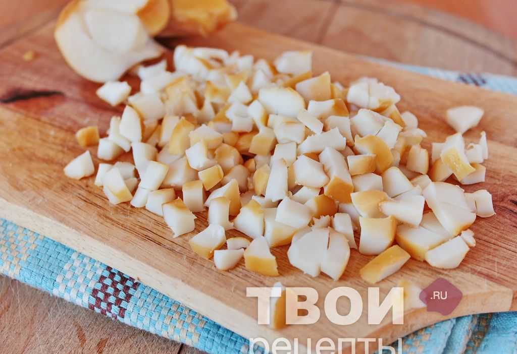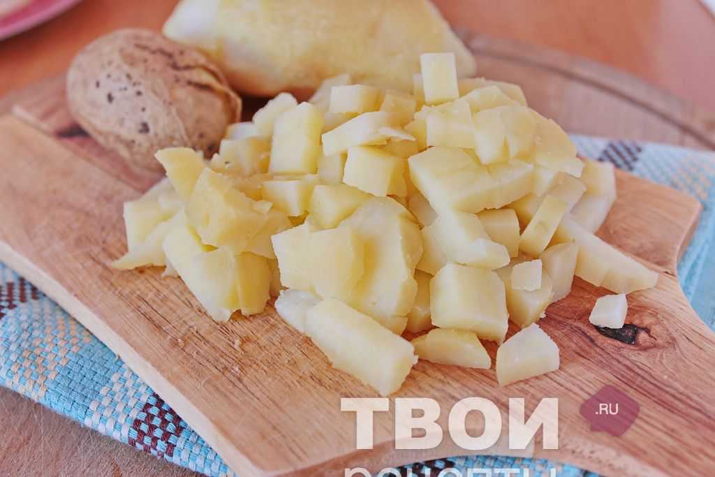 Картофель помыть, обернуть фольгой и запечь в духовке при 200 гр. в течение часа. Остудить, очистить, нарезать кубиком.
