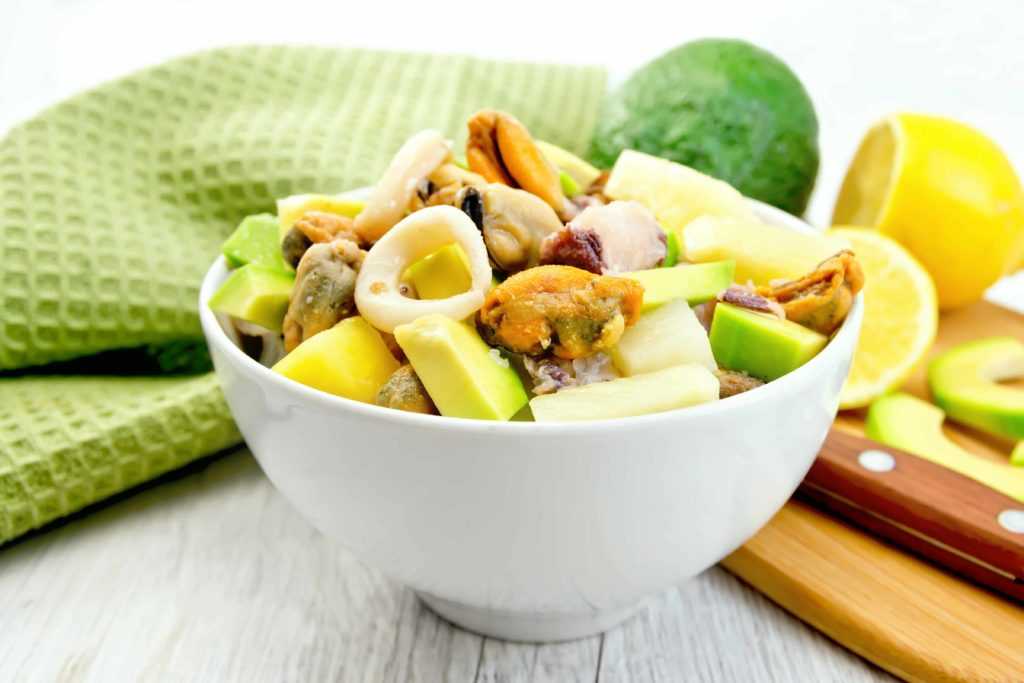 Мидии отвариваем в подсоленной воде 5 минут, затем воду сливаем. Нарезаем кубиками огурцы, авокадо, перец. Полукольцами – лук. Измельчаем укроп. Смешиваем овощи, сверху выкладываем мидии и посыпаем укропом. Заправляем. Для заправки смешиваем лимонный сок, горчицу, оливковое масло, соль, мед, йогурт. Даем полчаса настояться.