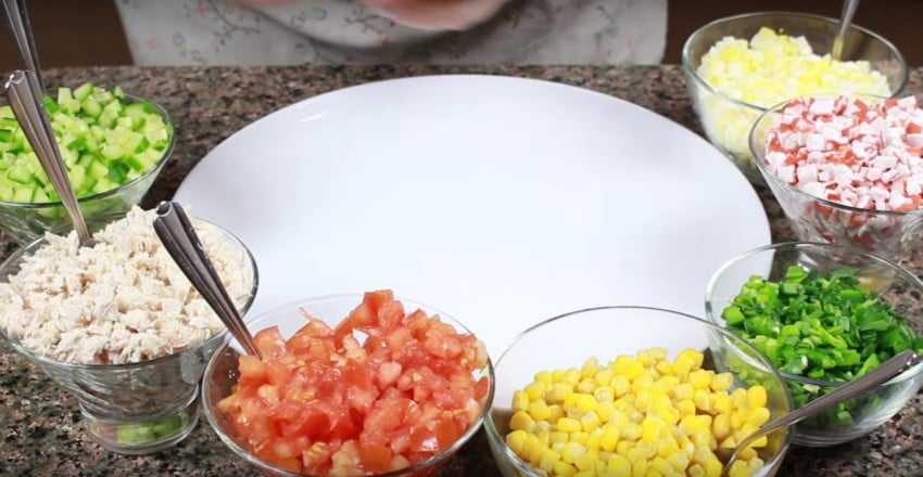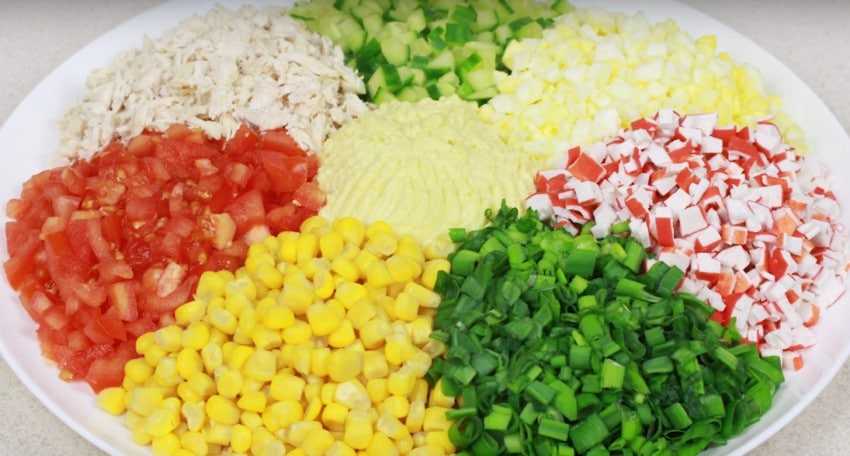 2. В середину блюда выложите майонез. После этого по кругу распределите остальные компоненты салата и подавайте его на стол.