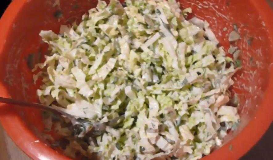 Для начала очистите, порубите и замаринуйте лук в смеси уксуса, воды и сахара примерно на 30-40 минут. Далее ополосните грибы и порежьте их тонкими пластинками, протомите на сковороде до выпаривания всей жидкости. Помойте и нарежьте пекинскую капусту. Смешайте все ингредиенты, добавьте соль и перец по вкусу.
