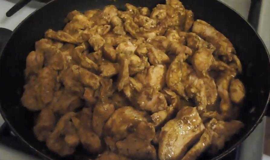 - Мясо достать из маринада, выложить на сковороду и залить сметаной, чтобы мясо полностью было покрыто. Тушить на слабом огне до частичного выкипания сметаны и приобретения ею плотной консистенции. Далее перемешать содержимое сковороды, сделать сильный огонь и готовить при постоянном помешивании, не допуская подгорания.