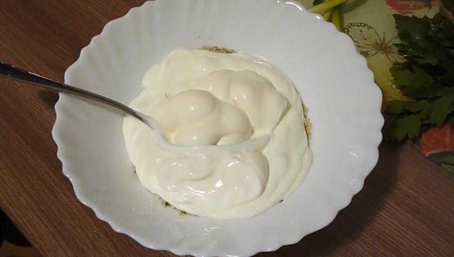 - Теперь нужно сделать соус. Сначала вылить в подходящую емкость кефир, затем понемногу добавлять майонез, при этом постоянно помешивая. Далее положить остальные 10 зубчиков давленого чеснока, измельченный укроп и выжать сок одного лимона. Все это как следует перемешать.