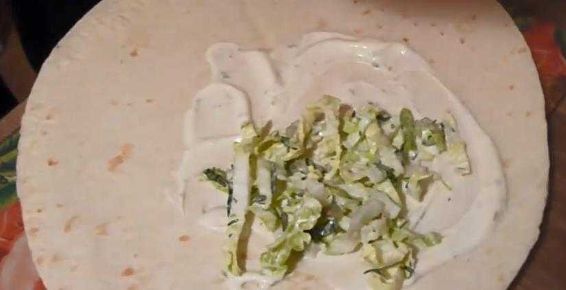 - Затем начинка смешивается с соусом и заворачивается в лаваш. А дальше можно или подрумянить на сухой сковороде, или прогреть в микроволновке.